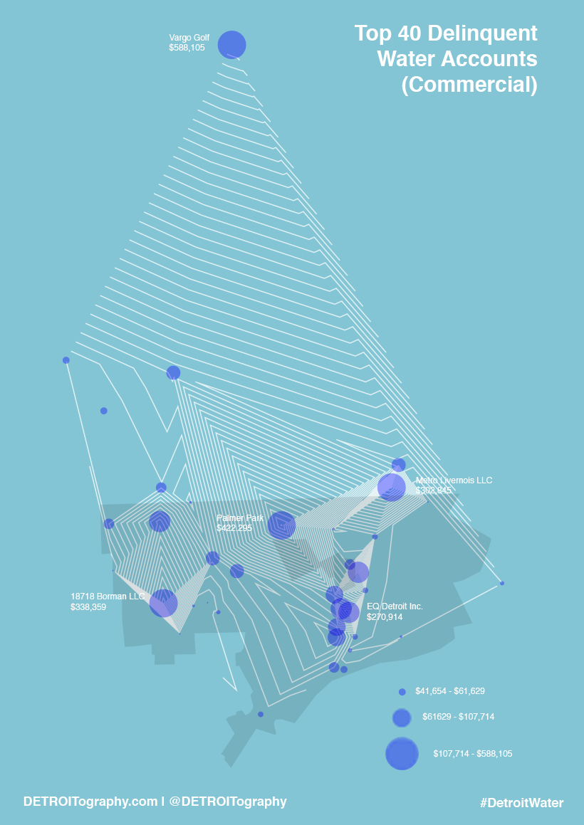 A list was finally published of some of the top commercial water customers with delinquent accounts. They have ranged from companies who have been in trouble in the past with Michigan’s Licensing and Regulatory Affairs (LARA) to individuals who seem to have attempted business ventures that failed. What is most surprising is that among the top 40 delinquent commercial accounts there is a cluster in Midtown and Downtown – the newly named “Innovation District.”