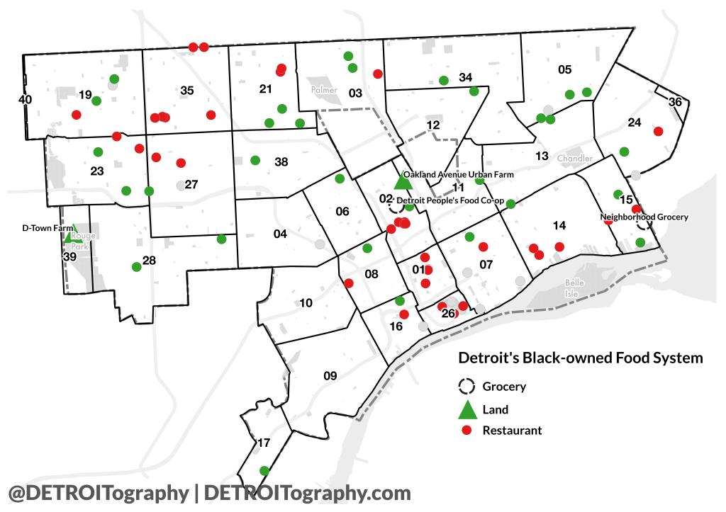 The repeated and compound impact of structural racism on Detroit’s food system couldn’t be more obvious than the need for a Black Farmer Land Fund, a Black Restaurant Week, and crowd-funding efforts for Black-owned grocery stores in the Blackest city in the US. These are just a few recent concerted efforts to change the status quo, but its important to note that this is NOT everything that is Black-owned in Detroit’s food system. The additional gray dots are food businesses catalogued by The Black Bottom Archives (add any missing businesses to their directory).