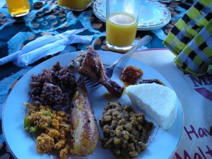 We had lunch in Osu, where there are many good resturants and tourists. At the Country Market we were treated to a variety of delicious Ghanaian dishes: fried plantain (banana), beans & rice, gari foto (from cassava), fish, chicken, yams, spinach, and freshly squeezed mango juice – liquid heaven.