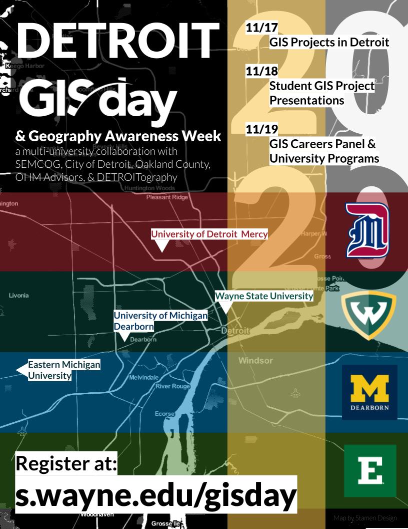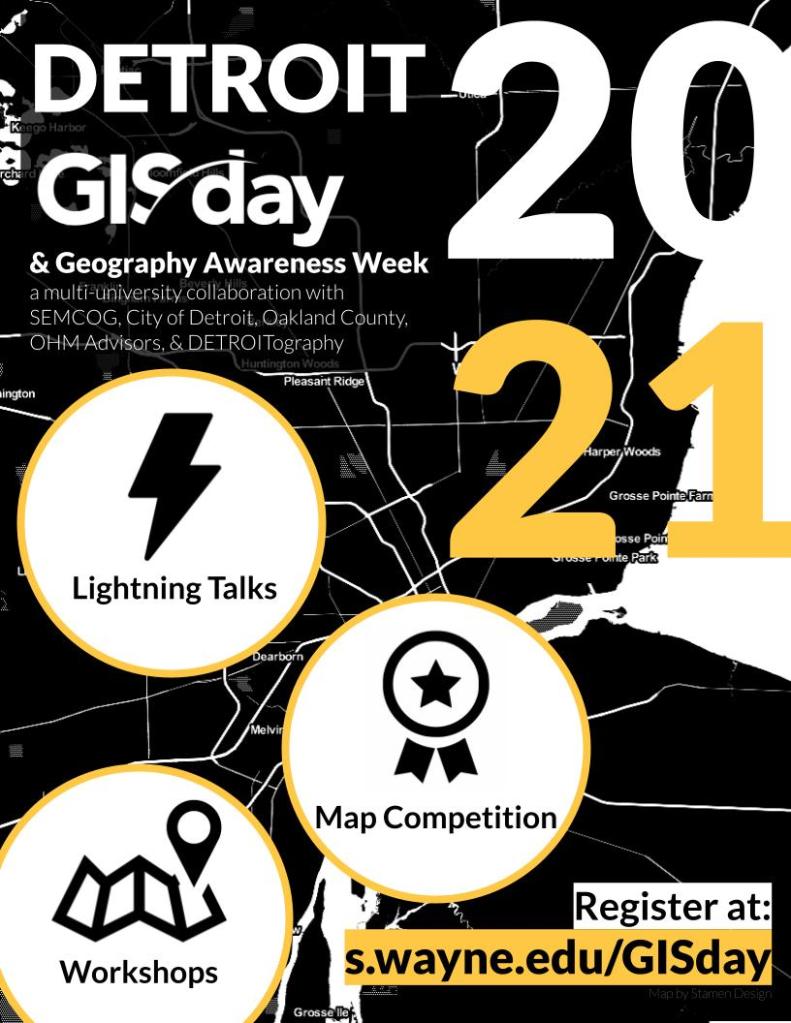 Detroit had not hosted a GIS Day since the 1990s. I started teaching Intro to GIS at Wayne State University and felt that the city needed to lift up its history of mapping the city and innovating spatial representations of information. The COVID-19 pandemic made the effort a bit more difficult and I decided to bring together all of the regional universities that were doing GIS and mapping work. The program was four days of workshops and panels hosted by each university as well as local governments.