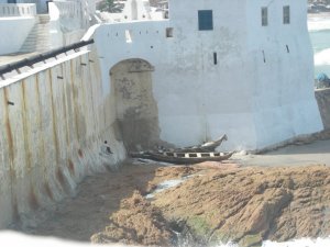 A fisher and his boats taking a rest in the nook of Cape Coast Castle.