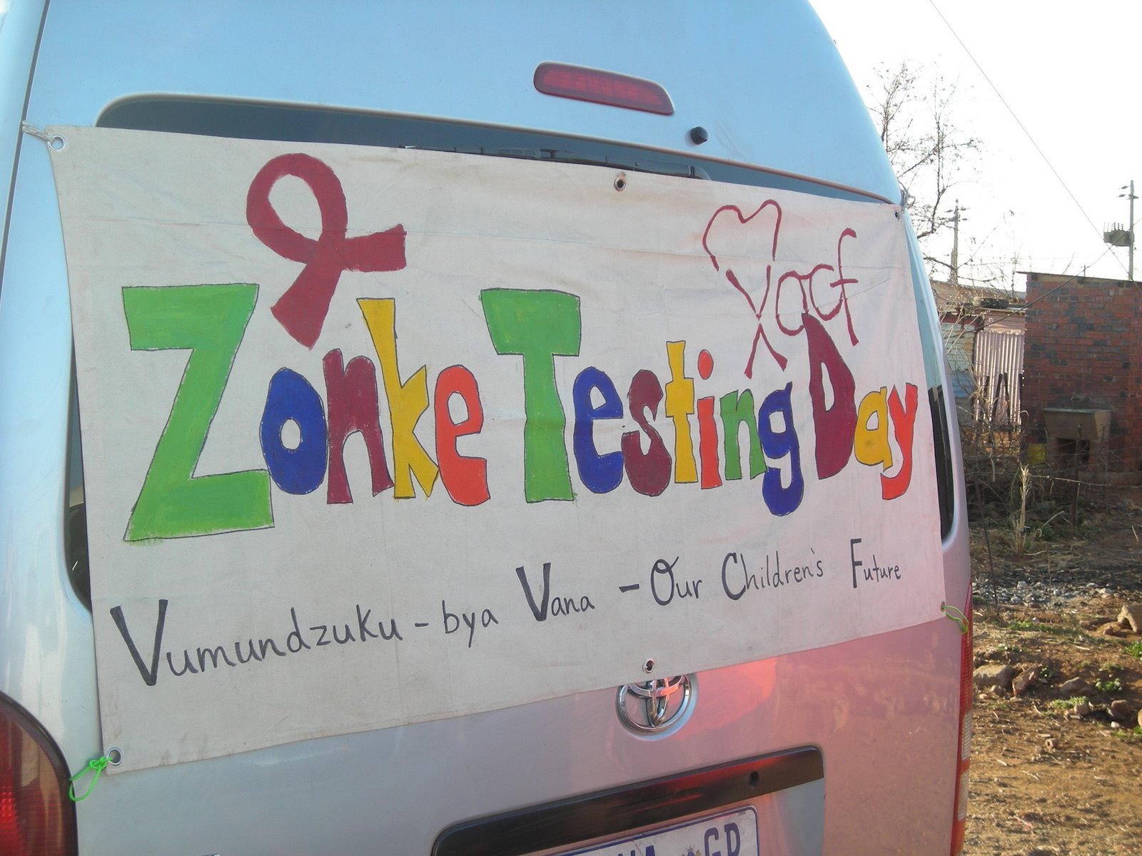 (photo: Zonke Testing Day banner on the back of a van used to transport people to the clinics)